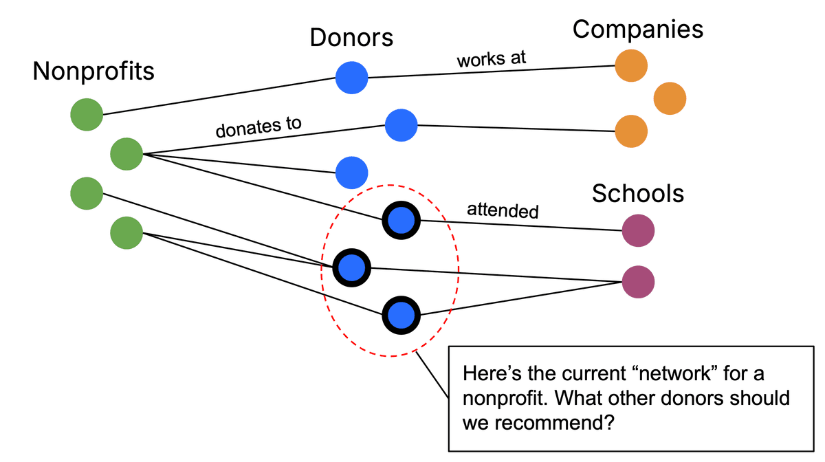 DonorAtlas maintains a graph database of donors, nonprofits, employers, schools, and other entities. Relationships between these entities are edges in the graph: if a donor works for Acme Corp, there's an edge between that donor and the Acme Corp node. If a donor has contributed to a nonprofit, there's an edge between the two.
